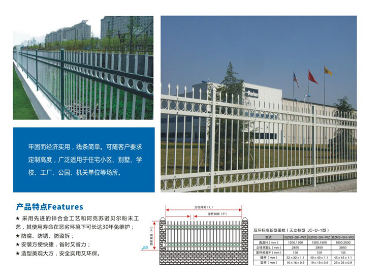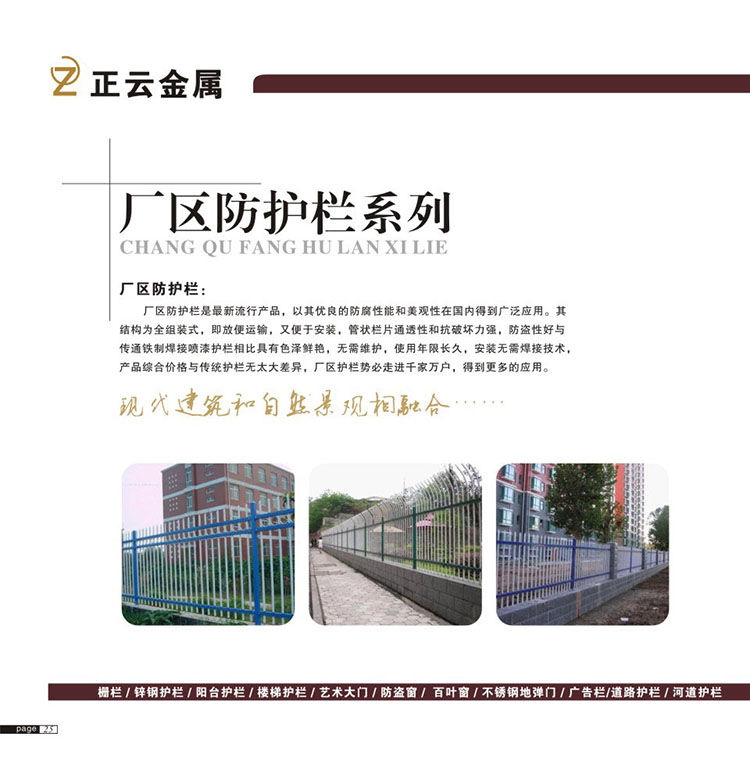 廠區(qū)防護(hù)欄:廠區(qū)防護(hù)欄是新流行產(chǎn)品,以其優(yōu)良的防腐性能和美觀性在國內(nèi)得到廣泛應(yīng)用。其結(jié)構(gòu)為全組裝式,既方便運(yùn)輸,又方便安裝,管狀欄片通透性和抗破壞性強(qiáng),防盜性好與傳統(tǒng)鐵質(zhì)焊接噴漆護(hù)欄相比具有色彩鮮艷,無需維護(hù),使用年限長久,安裝無需焊接,產(chǎn)品綜合價(jià)格和傳統(tǒng)護(hù)欄無太大差異,廠區(qū)護(hù)欄勢必走進(jìn)千家萬戶,得到更多的應(yīng)用。